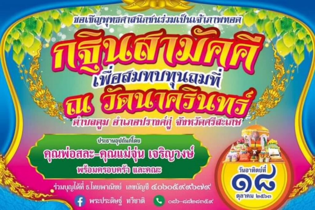 ขอเชิญพุทธศาสนิกชนร่วมเป็นเจ้าภาพทอดกฐินสามัคคีเพื่อสมทบทุนถมที่
