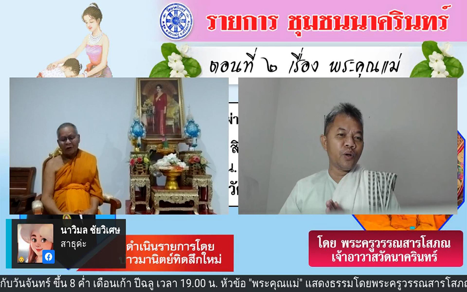 เมื่อ วันที่ 16 สิงหาคม 2564 ที่ผ่านมา ตรงกับวันจันทร์ ขึ้น 8 ค่ำ เดือนเก้า (9) ปีฉลู เวลา 19.00 น. วัดนาครินทร์จัดให้มีการแสดงพระธรรมเทศนาผ่านสื่อออนไลน์ ในรายการสด “ชุมชนนาครินทร์” ตอนที่ 2 หัวข้อ “พระคุณแม่” แสดงธรรมโดยพระครูวรรณสารโสภณ (เฟื่อง รวิวณฺโณ) เจ้าอาวาสวัดนาครินทร์ ดำเนินรายการโดย บ่าวมานิตย์ทิดสึกใหม่ ออกอากาศทางหน้าเพจ วัดนาครินทร์