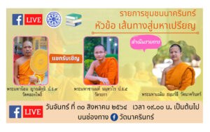 เชิญรับชมรายการสด “ชุมชนนาครินทร์” จะออกอากาศ ในวันที่ 30 สิงหาคม 2564 เวลา 19.00 น. ตอนที่ 4 หัวข้อ “เส้นทางสู่มหาเปรียญ”โดย พระมหานิยม ญาณสิทฺธิ ป.ธ.9 วัดคลองโพธิ์ และพระมหาชานนท์ นนฺทวโร ป.ธ.5 วัดระกา ดำเนินรายการโดย พระมหาเฉลิม ธมฺมรํสี วัดนาครินทร์ ออกอากาศทางหน้าเพจ วัดนาครินทร์