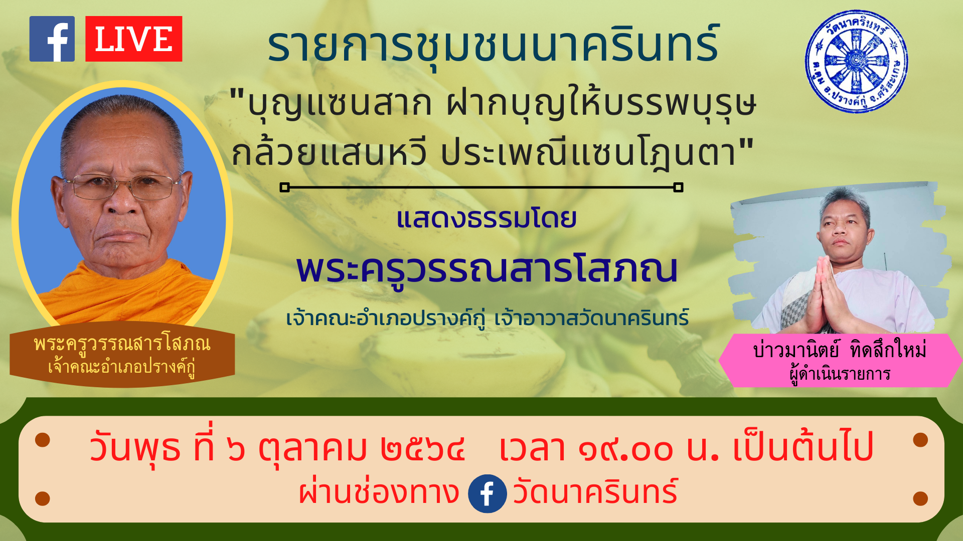 เชิญรับชมรายการ “ชุมชนนาครินทร์” ตอนที่ 10 ในวันพุธ ที่ 6 ตุลาคม 2564 ตรงกับวันวันแรม 15 ค่ำ เดือน 10 ปีฉลู ตั้งแต่เวลา 19.00 น. เป็นต้นไป ในหัวข้อ “บุญแซนสาก ฝากบุญให้บรรพบุรุษ กล้วยแสนหวี ประเพณีแซนโฎนตา” ทางรายการได้รับความเมตตาอย่างสูงยิ่งจาก พระครูวรรณสารโสภณ (เฟื่อง รวิวณฺโณ) เจ้าคณะอำเภอปรางค์กู่ – เจ้าอาวาสวัดนาครินทร์ เป็นองค์บรรยายธรรม ดำเนินรายการโดย บ่าวมานิตย์ทิดสึกใหม่ ออกอากาศทางหน้าเพจ วัดนาครินทร์