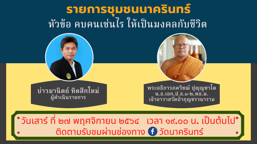 เชิญรับชมรายการ “ชุมชนนาครินทร์” ตอนที่ 17 ซึ่งเป็นวันพระ แรม 8 ค่ำ เดือน 12 ปีฉลู ตรงกับวันเสาร์ ที่ 27 พฤศจิกายน 2564 เริ่มตั้งแต่เวลา 19.00 น. เป็นต้นไป ในหัวข้อ “คบคนเช่นไร ให้เป็นมงคลกับชีวิต” ทางรายการได้รับความเมตตาอย่างสูงยิ่งจาก พระอธิการภควิชฌ์ ปุญฺญชาโต เจ้าอาวาสวัดป่ากุญชรวนาราม ต.สวาย อ.ปรางค์กู่ จ.ศรีสะเกษ เมตตาเป็นองค์บรรยายธรรม ดำเนินรายการโดย บ่าวมานิตย์ทิดสึกใหม่ ออกอากาศทางหน้าเพจ วัดนาครินทร์