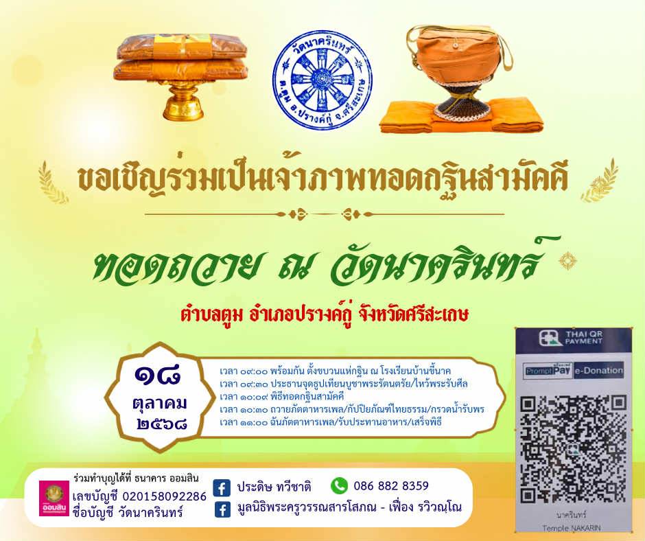 คณะกรรมการบริหารวัดนาครินทร์ ตำบลตูม อำเภอปรางค์กู่ จังหวัดศรีสะเกษ พร้อมด้วยพุทธศาสนิกชน ขอเชิญผู้มีจิตศรัทธาร่วมเป็นเจ้าภาพทอดกฐินสามัคคี ประจำปี พุทธศักราช 2568 ในวันเสาร์ที่ 18 ตุลาคม 2568 ณ วัดนาครินทร์